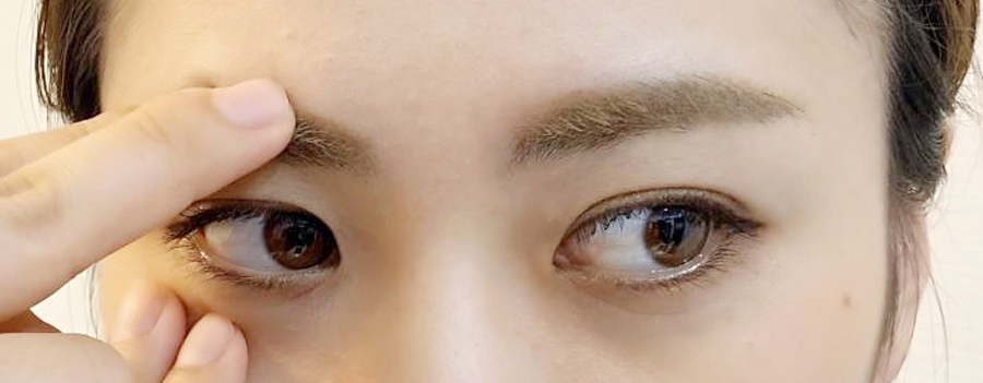上まぶたは動かさずに固定したまま、反対の指で下まぶたを軽く押さえ、まぶしいものを見て目を閉じるときのように、下まぶただけを引き上げる。