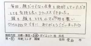 「毎回顔だけでなく全身を施術していただき、 とても気持ちよくリラックスできました。 頭も顔もとても小さくなり、 形も整い♡Happy♡です!! ありがとうございました♡」