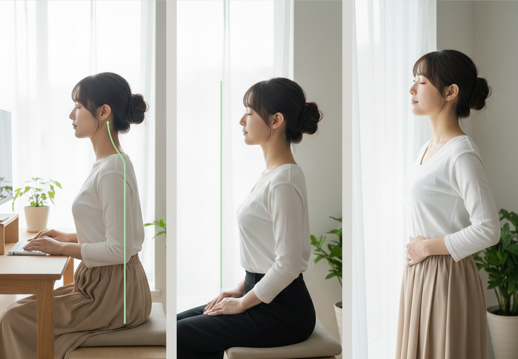 A. できることを増やすより、やめる工夫が効きます。うつむき時間を減らす画面位置、深呼吸で力みをリセットする習慣など、数秒でできるものを1つ決めると続けやすいです。