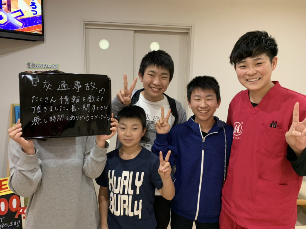 • 事故の治療で通わせて頂きましたが、先生方の治療のおかげで、痛みもなくなりました!!楽しく通えて、痛みもなくなって良いことばかりでした!!ありがとうございました。