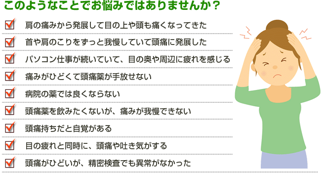 「両側のこめかみから頭の周囲を締め付ける」ような痛みを感じることが多く、片頭痛のようにズキンズキンと脈を打つような頭痛とは痛み方が異なります。片頭痛と合併する場合もよくあります。