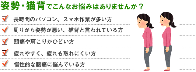 女性場合は猫背によって冷え性やくびれがない、バストが下がっている、老けて見えてしまうなど姿勢が悪いだけでかなり損してしまいます。 男性も姿勢が悪いと、自信がない、頼りがいがない等仕事にも影響してしまいます。